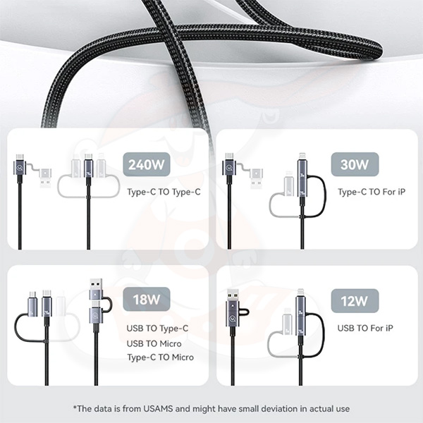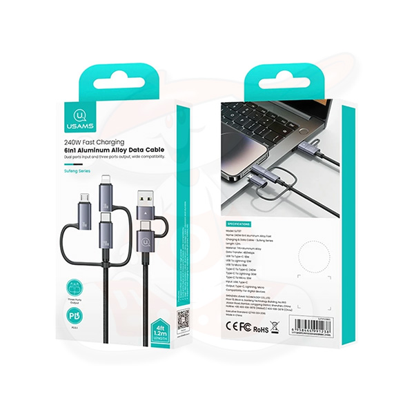 کابل شارژر همه کاره usams مدل us-sj738 ،دارای 3 پورت microUSB – میکرو ، Typec- تایپ سی و لایتنیگ میباشد که شما را از همراه داشتن چندین کابل راحت میکند و سر دیگر این کابل یک پورت USB-A و یک پورت تایپ سی است. در واقع اگر بخواهیم انواع این کابل 6 در 1 را شرح بدهیم،شما با داشتن این کابل ،کابلهای زیر را به صورت یکجا در اختیار دارید:... ( کابل شارژ تایپ سی به تایپ سی ، کابل شارژ تایپ سی به USB-A – کابل شارژ لایتنینک به تایپ سی ، کابل شارژ لایتنینگ به USB-A – کابل شارژ میکرو usb به تایپ سی ، کابل شارژ میکرو usb به USB-A)... جنس این کابل کنفی میباشد که بسیار مقاوم و با کیفیت ساخته شده است و در برابر گره خوردگی و پارگی مقاومت دارد. طول کابل چند سر یوسمز 200 سانتیمتر است و برای فواصل نسبتاً طولانی بسیار مناسب میباشد. از دیگر مزایای کابل همه کاره یوسمز مدل sj738 حداکثر قدرت شارژدهی این کابل میباشد که تا 240 وات است.
